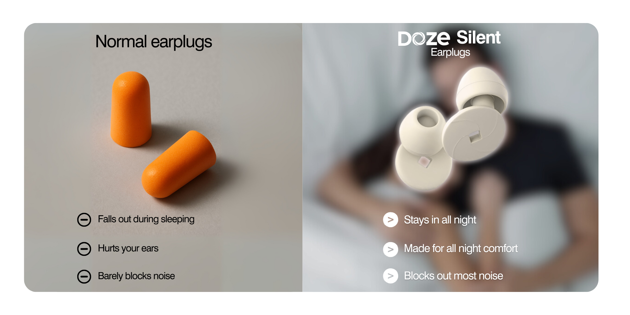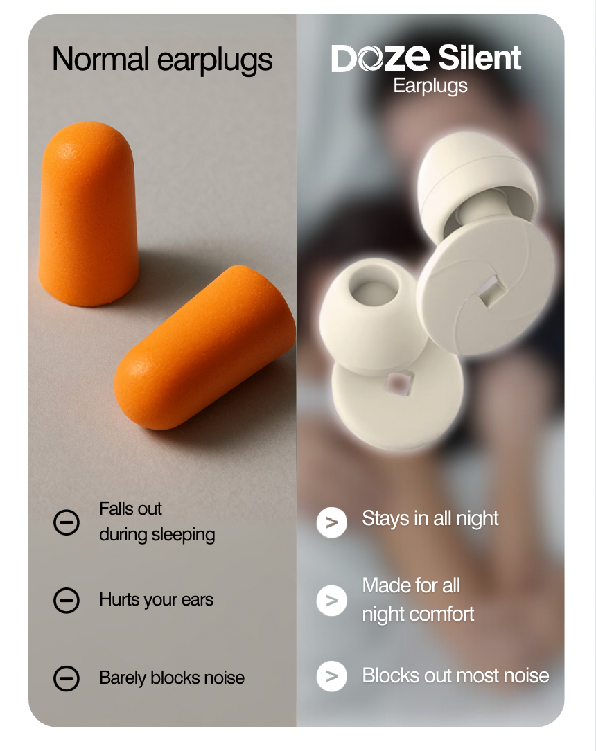 Designed for maximum noise reduction, Doze Silent earplugs help you sleep soundly, no matter the noise around you. Soft, comfortable, and effective—wake up feeling refreshed every morning.